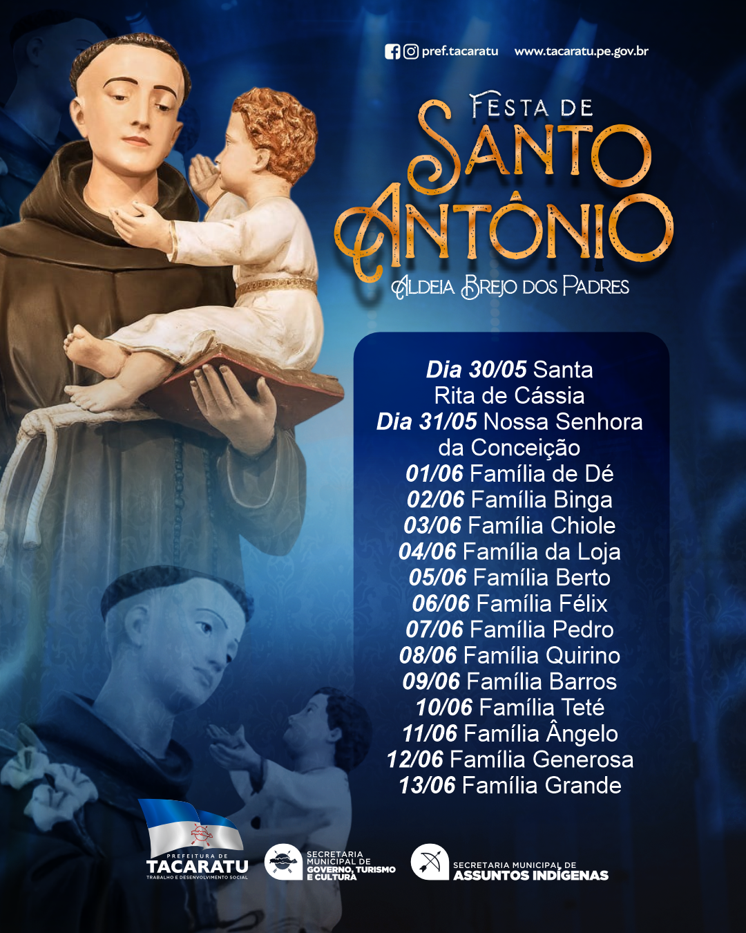 A festa do Padroeiro da Aldeia Brejo dos Padres está se aproximando e todos estão convidados para prestigiar as noites de Santa Rita de Cássia, Nossas Senhora da Conceição e a Trezena de Santo Antônio. Confira a programação